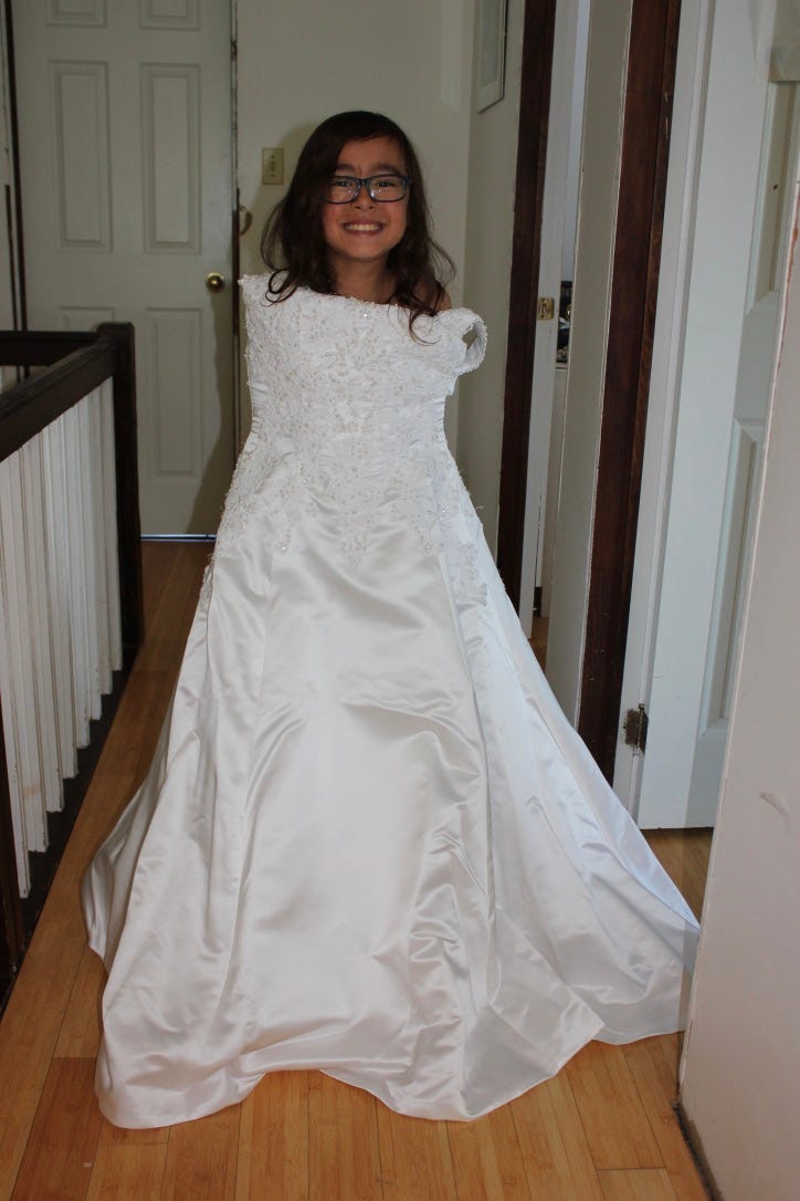 I have a white wedding dress (see our daughter trying it on, above), the red cheongsam my parents made, and the cheongsam my parents bought me a few years later (not sure why, they just did), and at least three cheongsams my grandmother had made in Hong Kong that are too small for me.